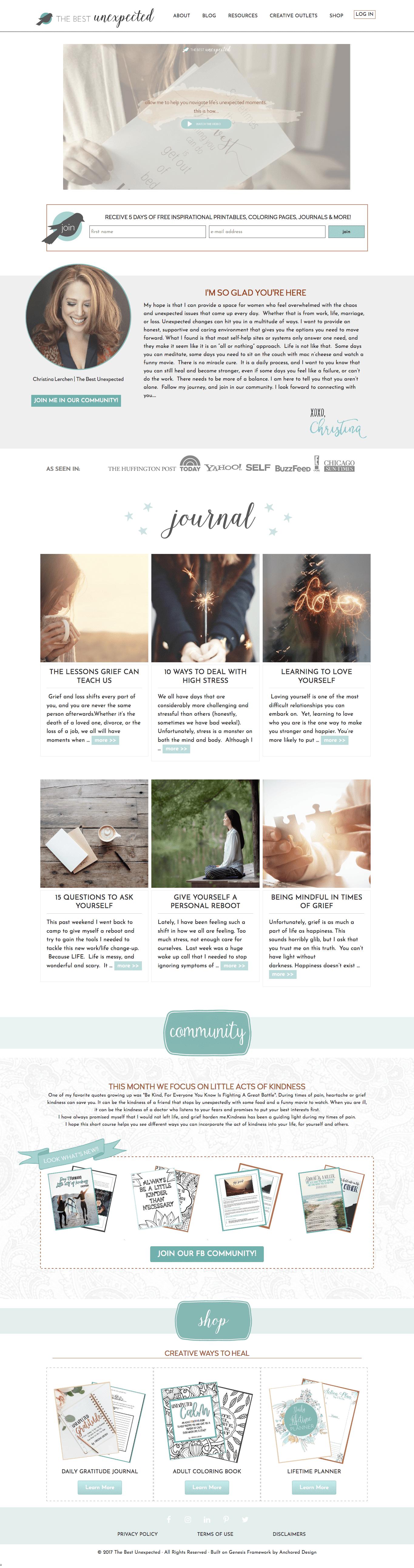 Christina Lerchen is the founder of The Best Unexpected. A community blog with people who have struggles in life come together and help one another. Christina provides help and personal experiences. She provides grief resources, such as online counseling, professional grief counseling, grief journals and group counseling through her website. Christina came to Anchored Design to ensure her viewers can navigate her website with success.